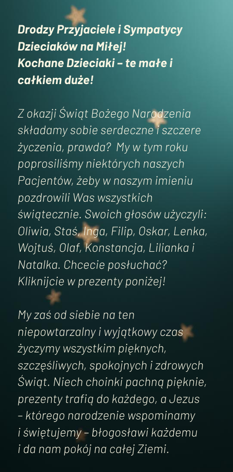 Święta Bożego Narodzenia to najpiękniejsze i najbardziej radosne święta z bogatą tradycją i pięknymi kolędami. Cieszmy się tym niezwykłym czasem i przeżyjmy niepowtarzalne chwile w cudownej atmosferze w zdrowiu, pokoju i wzajemnej bliskości, bez pośpiechu, z dala od wszystkich trosk i zmartwień. Niech Nowonarodzone Dziecię błogosławi nam i strzeże. Niech obdarzy swą łaską nie tylko […]